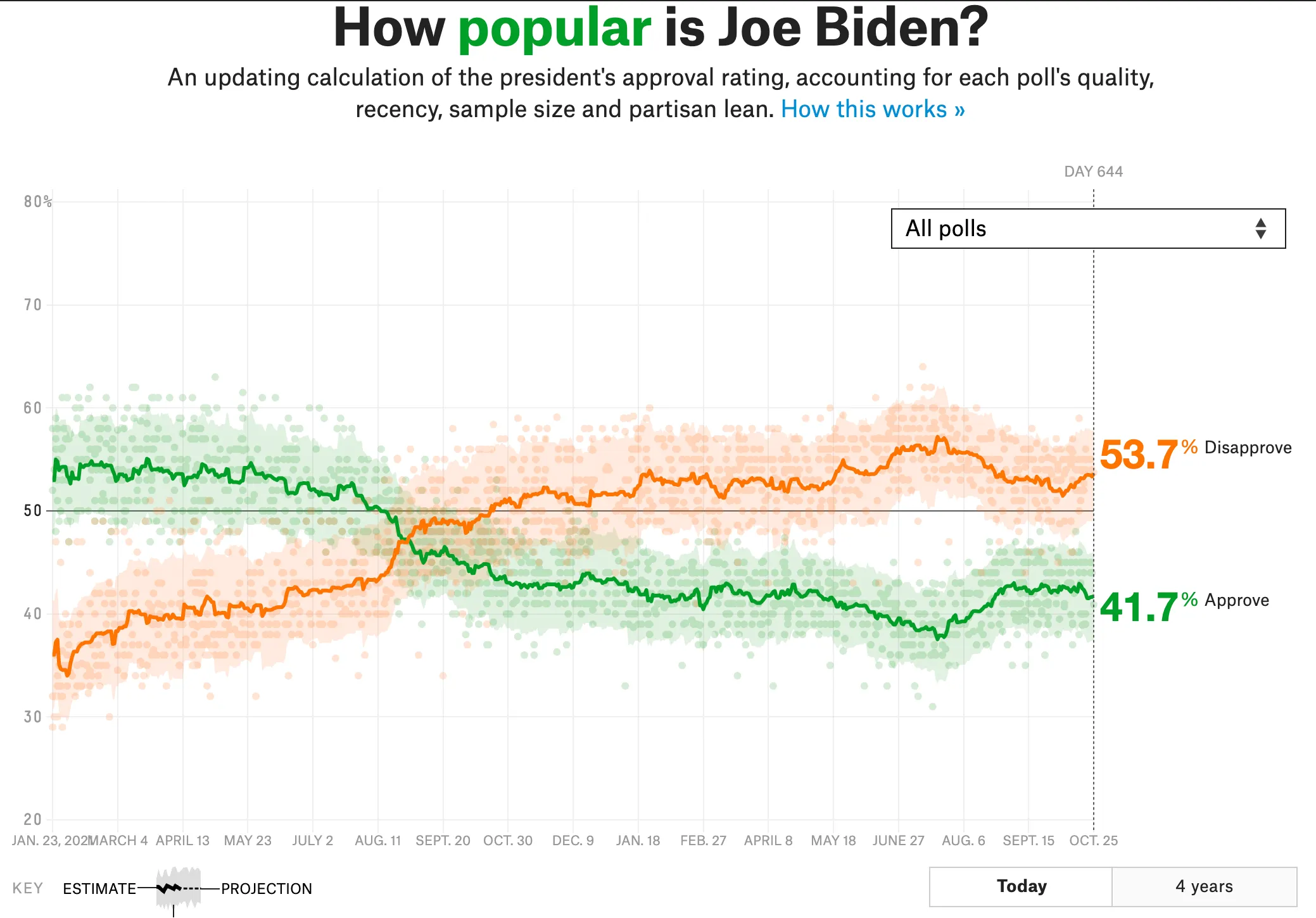 Популярність Джо Байдена серед американців залишається на позначці у 40%, що є найнижчим рейтингом за увесь час його президентства. Білому Дому напередодні виборів вдалося трохи збільшити рейтинг президента, проте Байден програє у популярності навіть Дональду Трампу, у той же період його керування країною.