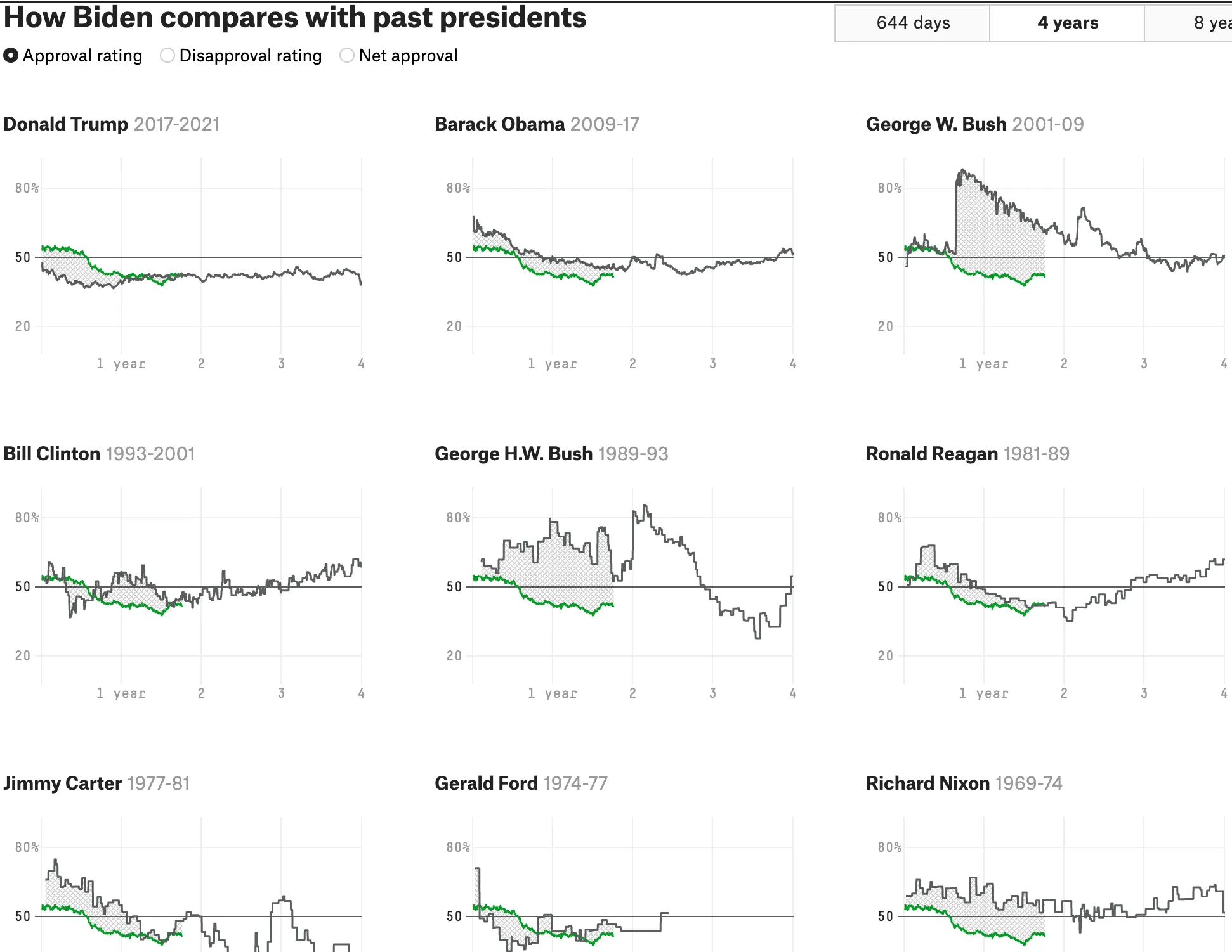 Як змінювалась підтримка Байдена у порівнянні з попередніми президентами / інфографіка проєкту ABC FiveThirtyEight
