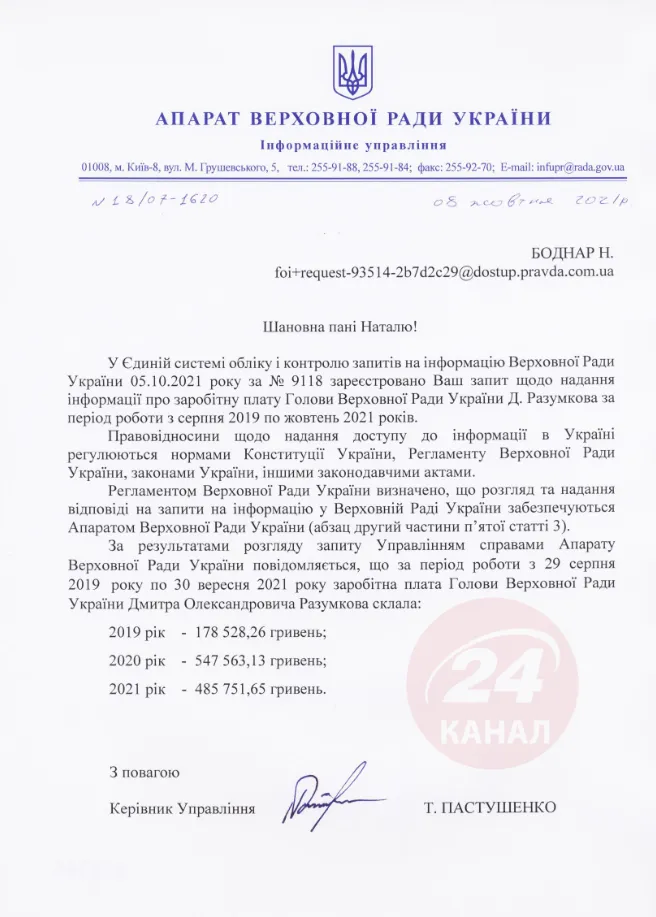 Яку зарплату отримав Разумкова за час роботи спікером / Фото 24 каналу
