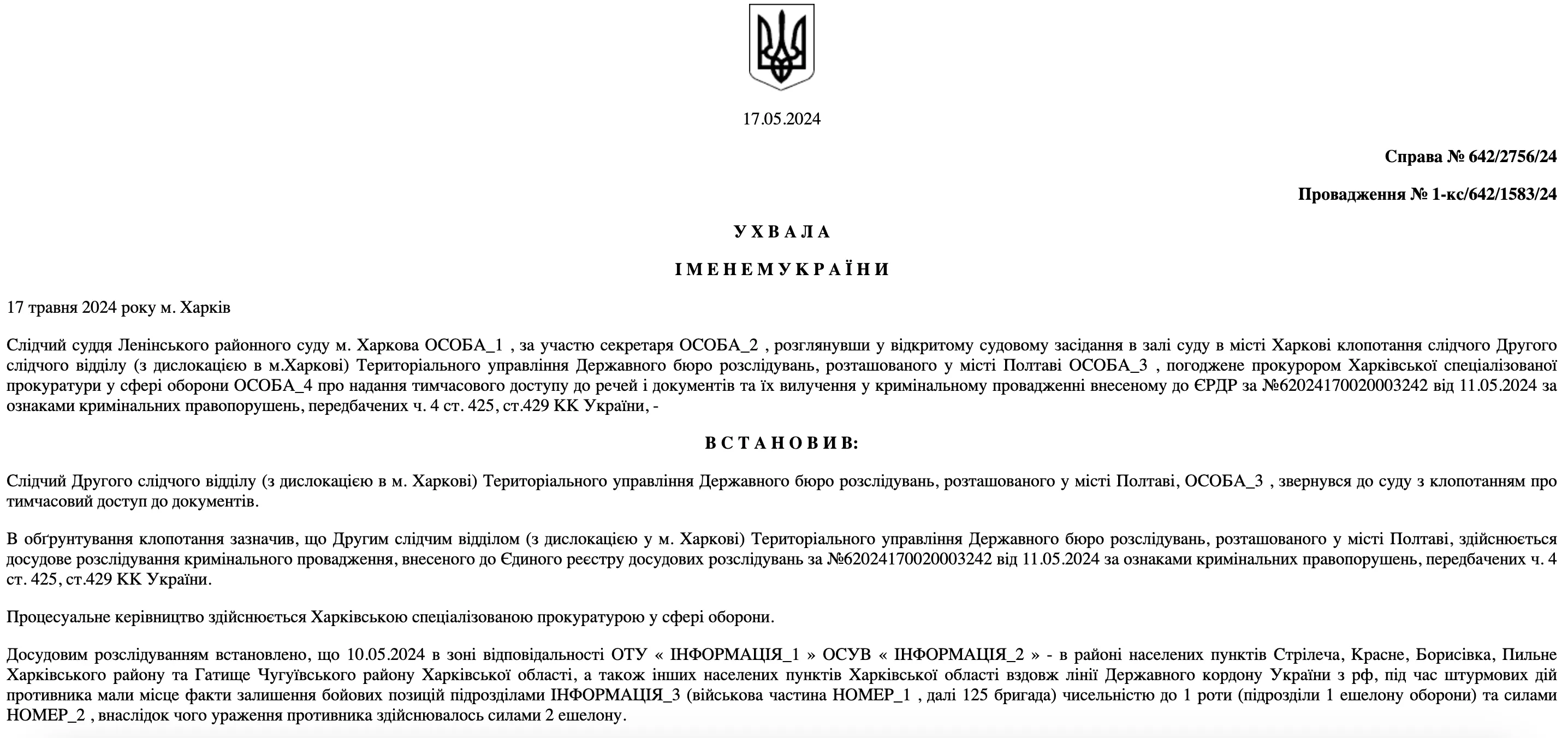 В ухвалі суду у місті Харкові від 17 травня мовиться, що досудове розслідування встановило, що 10 травня біля Стрілечої, Красного, Борисівки, Пильного, Гатища та інших населених пунктів Харківської області підрозділи 125 окремої бригади територіальної оборони залишили бойові позиції під час штурму росіян.