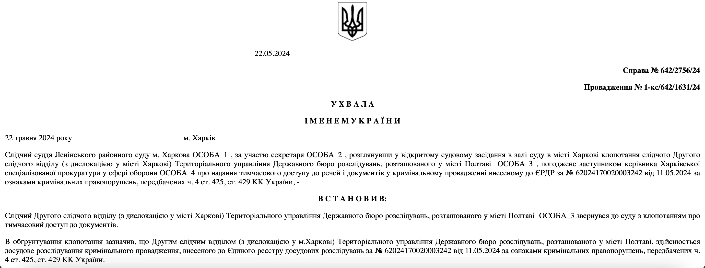 Ухвала суду, де фігурують 56 осіб щодо справи з проривом кордону ворогом у Харківській області / Скриншот 24 Каналу