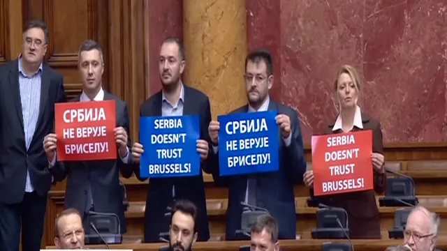 Частина цих депутатів скандувала гасла, а кілька парламентарів тримали плакати із написами: "Сербія не вірить Брюсселю".