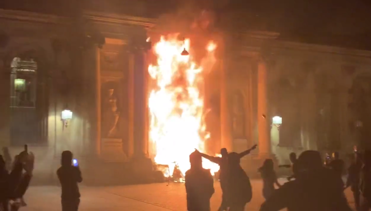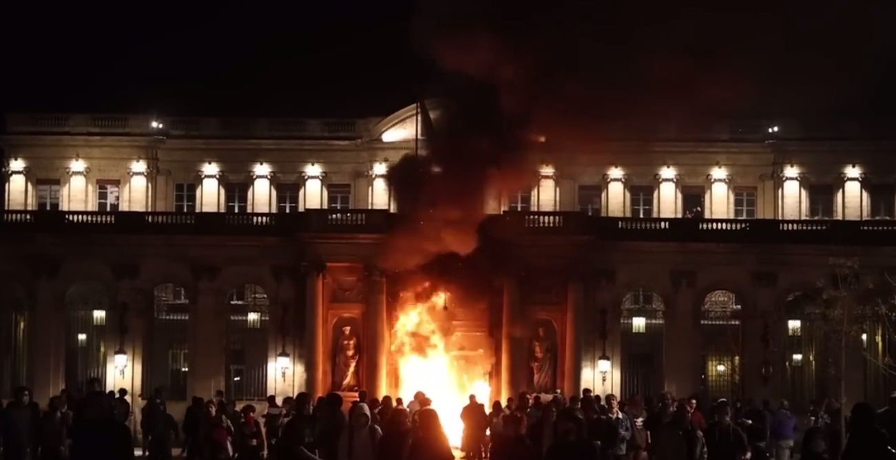 Під час чергової хвилі мітингів 23 березня у французькому місті Бордо невідомі підпалили будівлю мерії. Загоряння екстрено ліквідувала пожежна бригада.