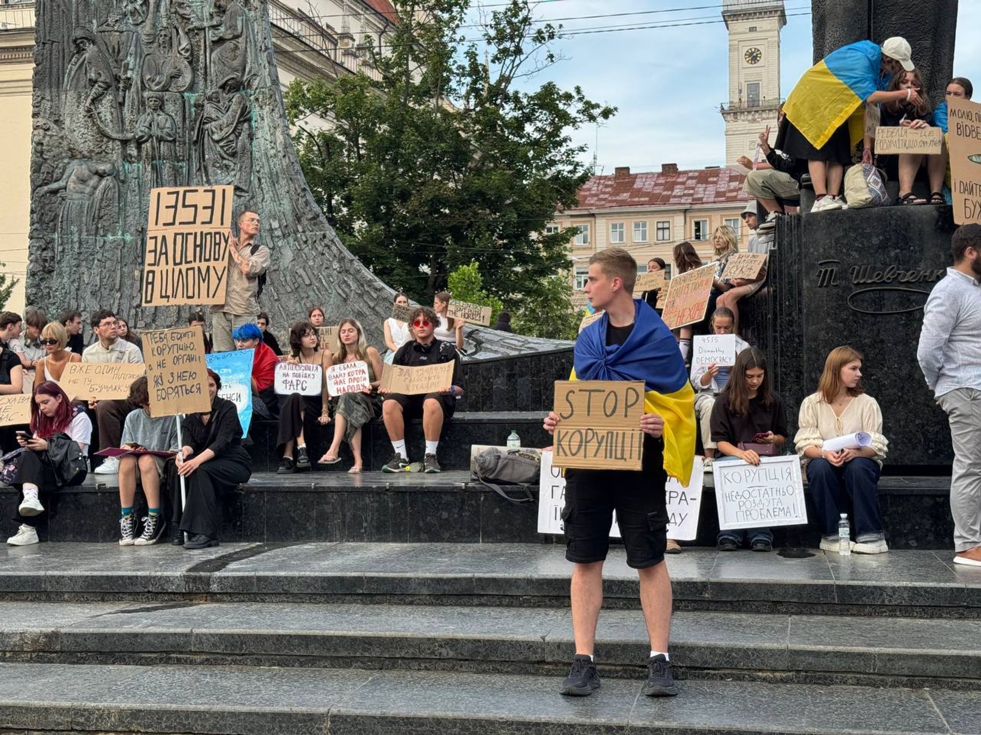 Тим часом сотні людей зібралися біля пам'ятника Шевченку у Львові. Акція розпочалася о 19:30. Учасники принесли плакати з написами "Я стою за незалежність НАБУ та САП", "Корупція – вбивця майбутнього", "STOP корупції" тощо.