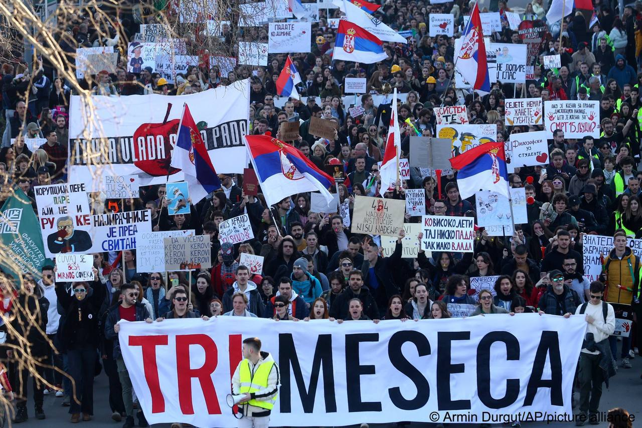 До акції приєдналися студенти з різних регіонів Сербії, які пішою ходою подолали 80 кілометрів, аби підтримати протест. Учасники тримали транспаранти з гаслами: "Три місяці – досить", "Ми вистоїмо", "15 загиблих, 0 відповідальних".