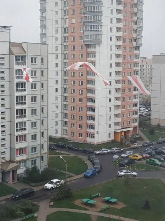Білоруси продовжують фарбувати країну у біло-червоно-білі кольори. Національні прапори розвішують на багатоповерхівках та навіть на стільникових вежах.