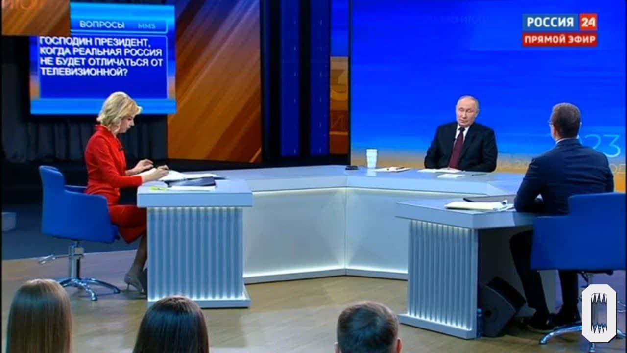 Водночас Путін під час того, як ці запитання висвітлювалися на екранах в залі з журналістами, продовжував вигадувати, як все добре в Росії.