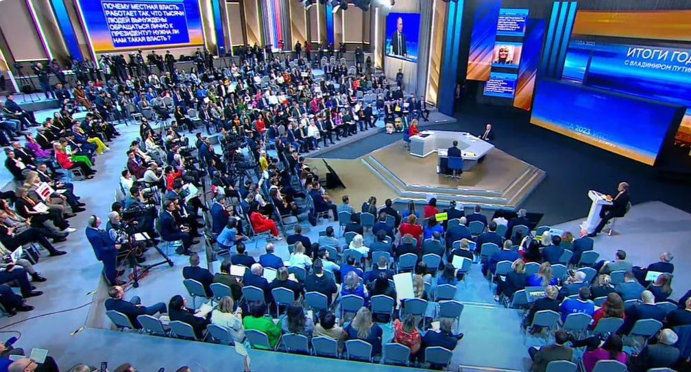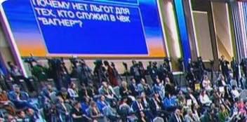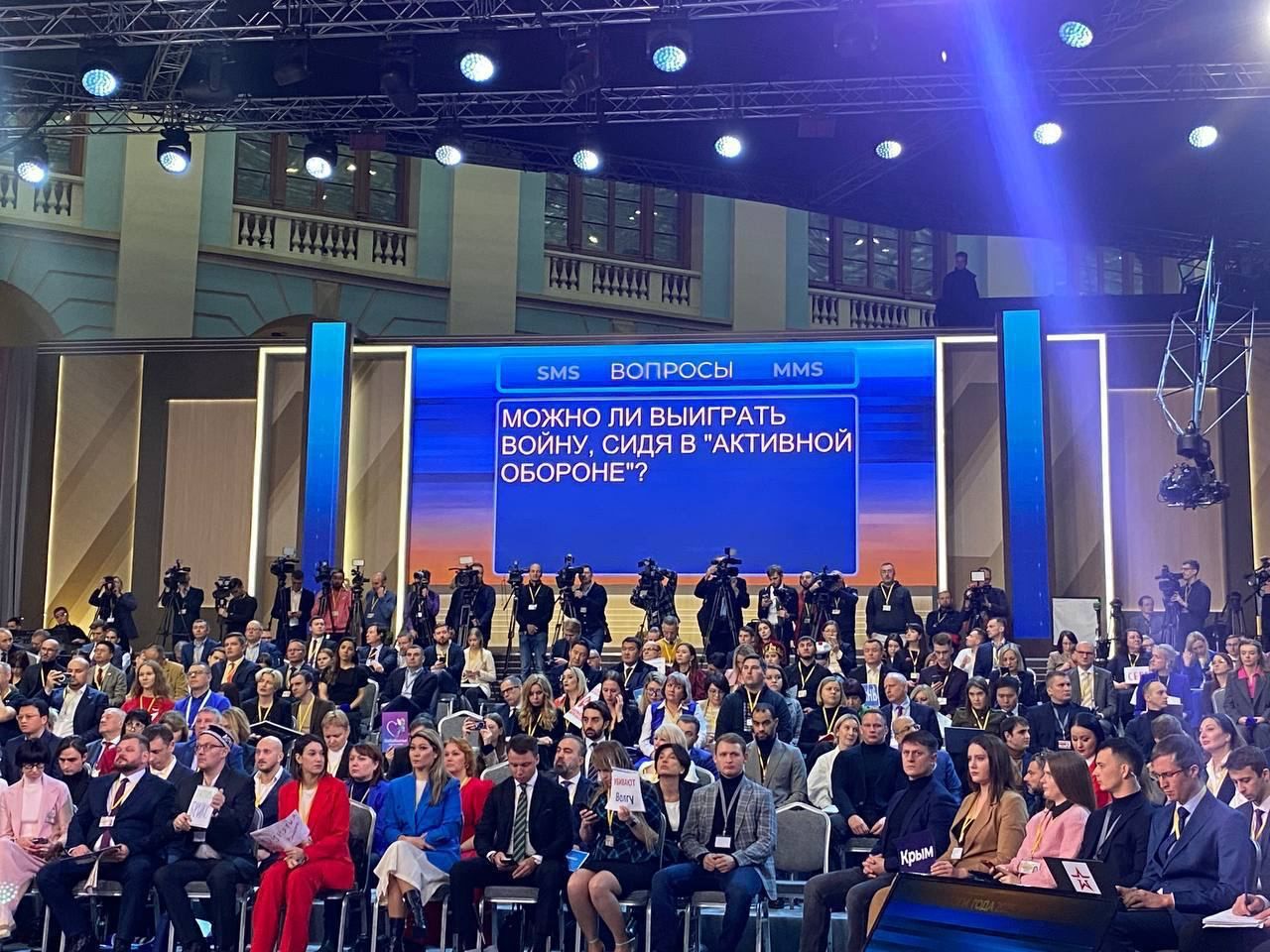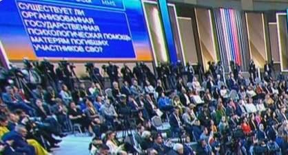 Водночас на екранах, що присутні в залі, рандомно почали висвітлюватися гострі запитання у форматі СМС-повідомлень, які писали люди. Їх голова ворожої держави просто-таки ігнорує, – інформує 24 Канал з посиланням на телеграм-канали.
