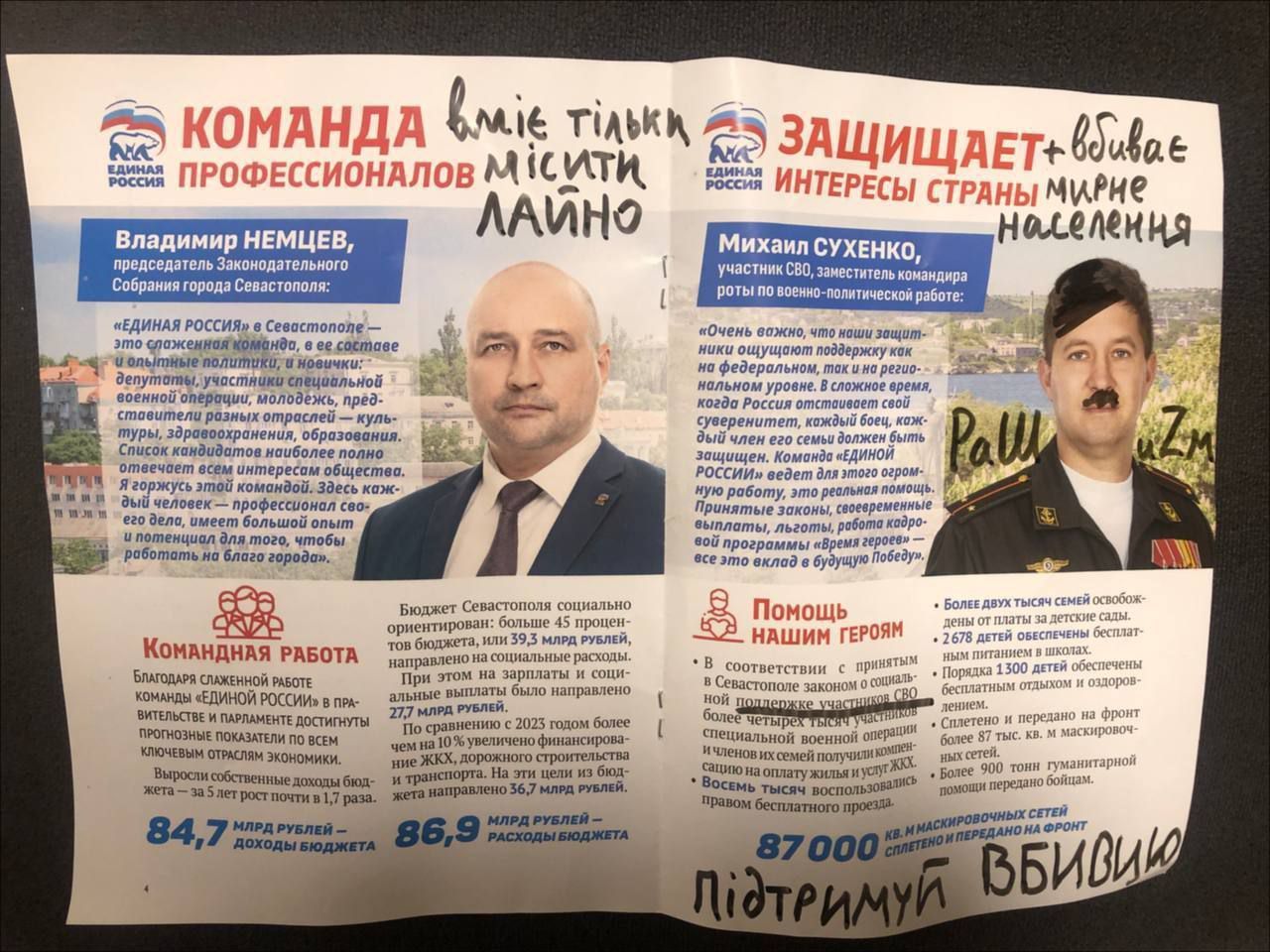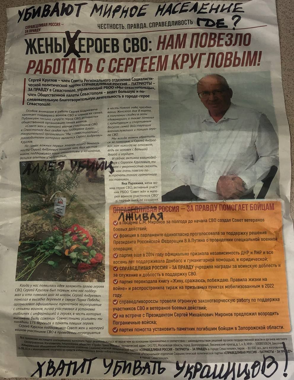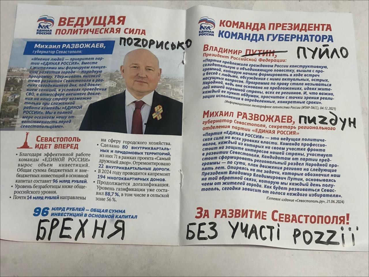 Окупанти поширювали наративи в дусі радянського вислову "молода республіка в оточенні ворогів". Вони нарікали, що часи важкі, триває "есвео", накладено санкції, але батьки міста в особі Аксьонова та Развожаєва неухильно дбають про Севастополь і рублем вкладаються в його "розвиток". При цьому пильнують, щоб учасники цього самого "есвео" були соціально захищені.