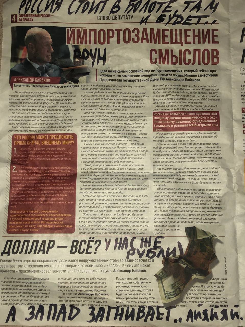 А ще, як виявилося, в Криму відбувається "імпортозаміщення смислів" – мовляв, росіяни шукають свій, а не імпортний сенс життя. Бо "сенс існування суспільства – не економіка". Ці глибокі слова належать заступнику голови Державної Думи. Цікаво, чи він сам зрозумів, що цим визнав фіаско російської економіки?