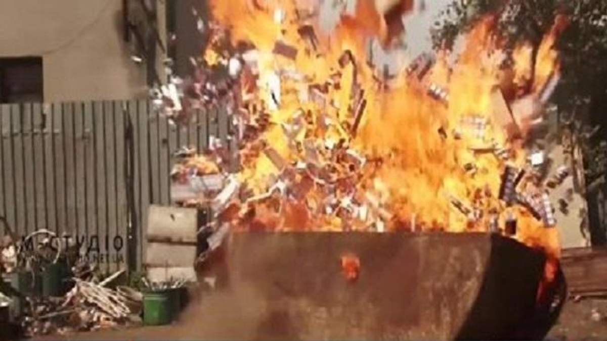 На кадрах із оприлюдненого ролика видно, як контейнер із цигарками поливають легкозаймистою речовиною та підпалюють.