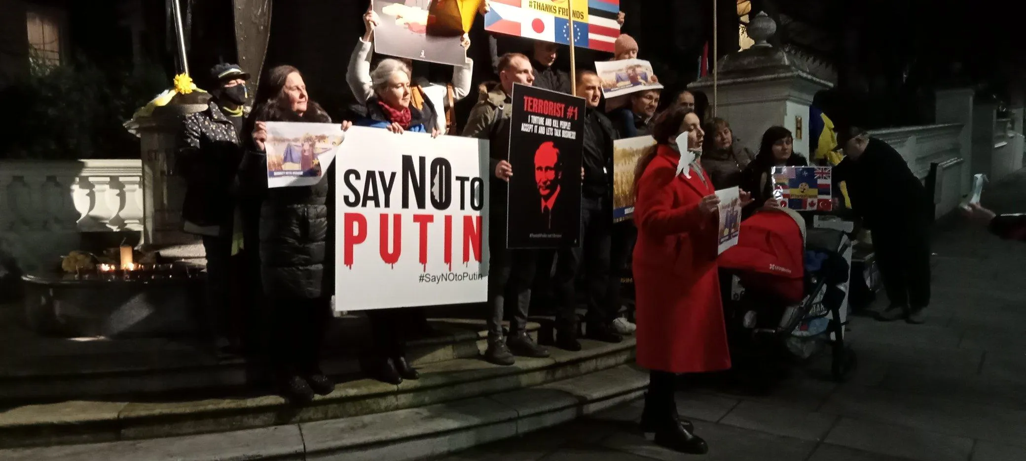Учасники акцій розгортали великі українські прапори та несли плакати із написами "Путін, геть руки від України", "Зупиніть Путіна, зупиніть війну", "Скажіть ні Путіну".