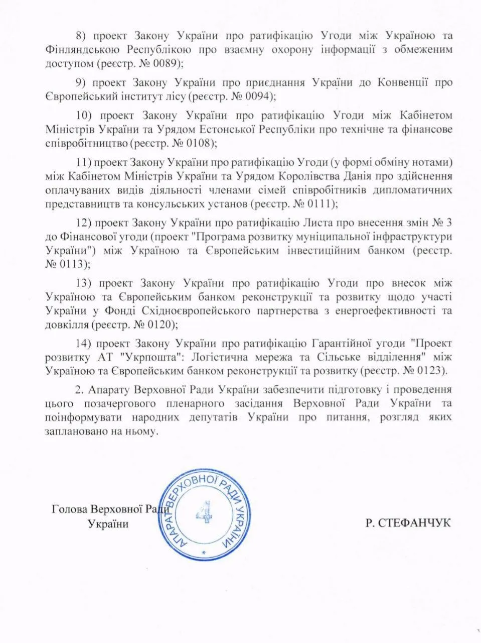- ратифікація угоди про внесок між Україною та Європейським банком реконструкції та розвитку. Домовленість стосується участі України у Фонді Східноєвропейського партнерства з енергоефективності та довкілля;