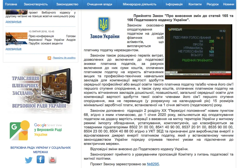 Згідно з усіма іншими документами на сайті Ради, зокрема стенограмою засідання і офіційними результатами голосування, норма про скасування ПДВ для імпортерів обладнання відновлюваної енергетики насправді не була підтримана. У сесійній залі 3 липня за цю поправку проголосували лише 155 депутатів з необхідних 226.