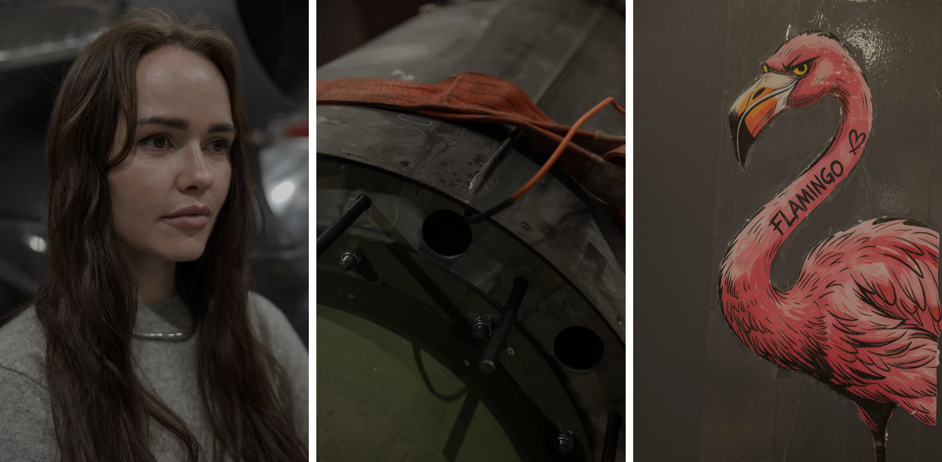 Журналістів до одного з підприємств везли із зав'язаними очима. Усередині – величезні машини, які намотують шари вуглеволокна на 12-метрові циліндри для ракетного палива, промислові сушарки та печі для виготовлення крил. На стіні висів плакат із фламінго та тузом піковим – відсилання до заяви Дональда Трампа про те, що Україна не має карт.