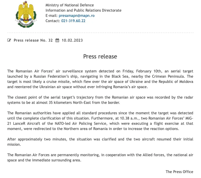 - Румунська влада заявляє, що застосувала всі стандартні процедури – о 10:38 два винищувачі МіГ-21 LanceR Румунських ВПС, які в цей момент виконували тренувальні польоти, були надіслані до північної частини Румунії для потенційного реагування.