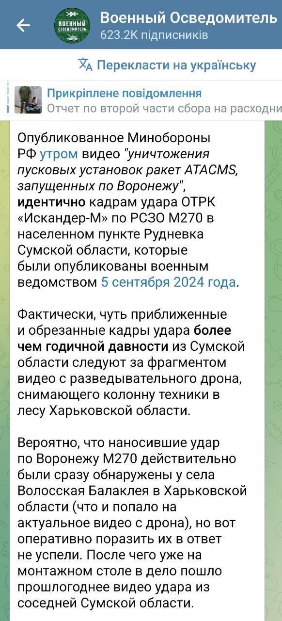 Аналітики InformNapalm зазначили, що російський мілітарний паблік "Военный Осведомитель", який має понад 620 тисяч читачів, фактично прямо звинуватив Міністерство оборони Росії у брехні щодо "оперативного ураження" пускових установок ATACMS, які 18 листопада завдали удар по військових об'єктах у Воронежі.