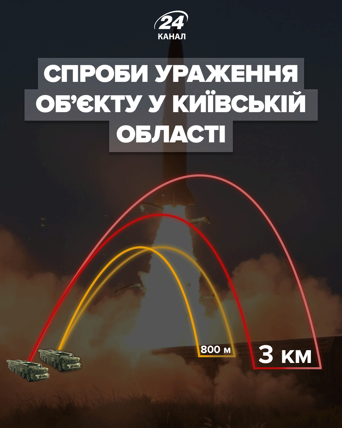 Намагаючись обстріляти, ймовірно, один з військових об'єктів під Києвом 26 серпня 2024 року, росіяни промахнулися двома ракетами на понад півтора кілометра, а ще двома – майже на 5.