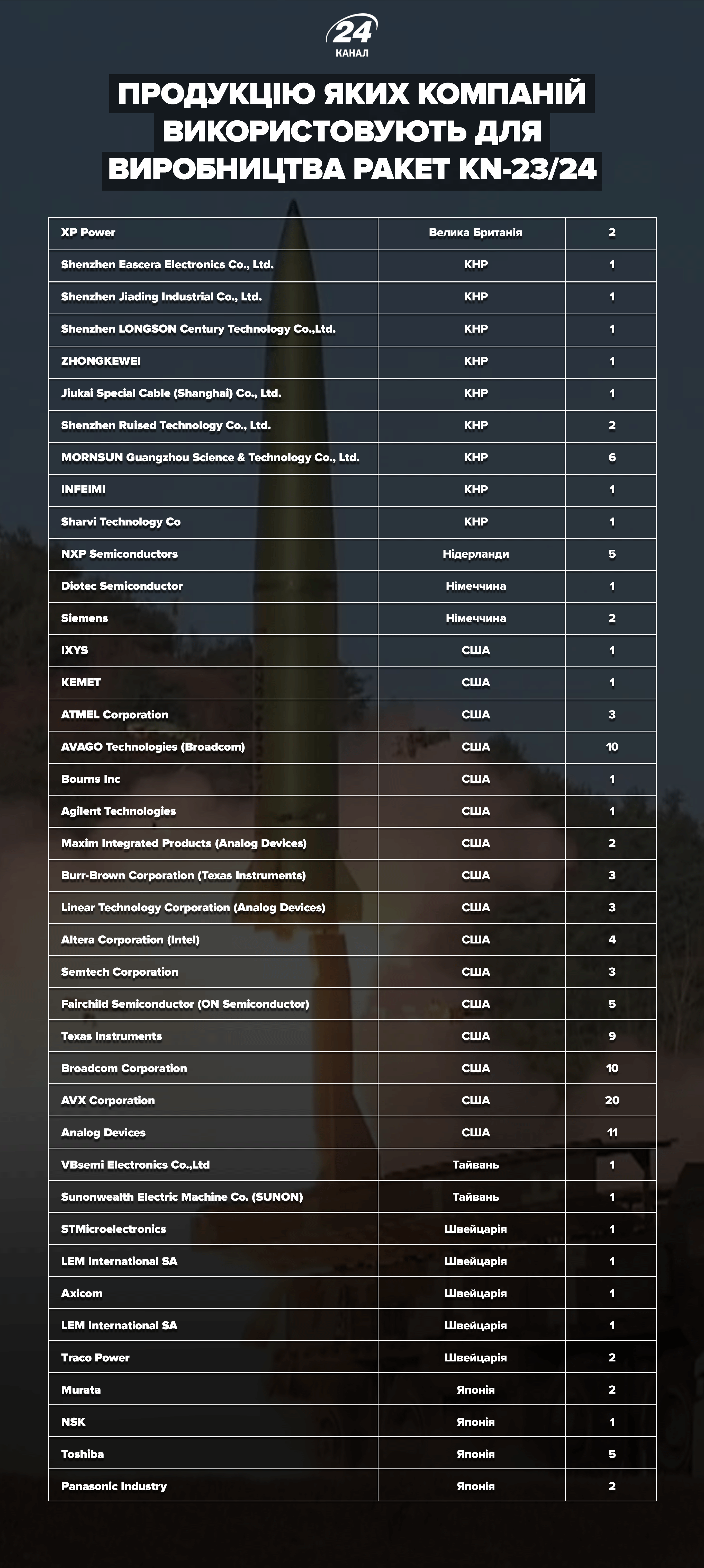 Дивіться перелік компаній, чию продукцію використовує КНДР для виробництва ракет KN-23/24:
