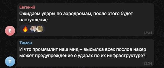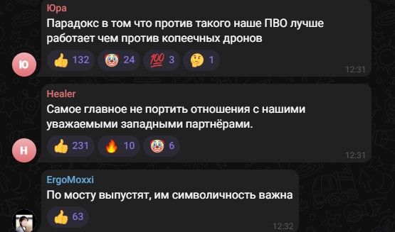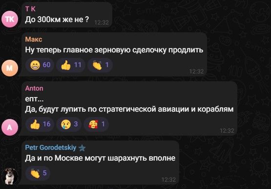 Росіяни почали скиглити, що тепер під удар можуть потрапити військові аеродроми, а в першу чергу – бояться за Крим. Вони вважають, що Україна буцімто "символічно" може завдати удару по Кримському мосту, а деякі припускають, що ЗСУ можуть зайти ще далі. Ба більше, користувачі бояться атак на Москву та інші великі міста, які можуть потенційно стати ціллю.