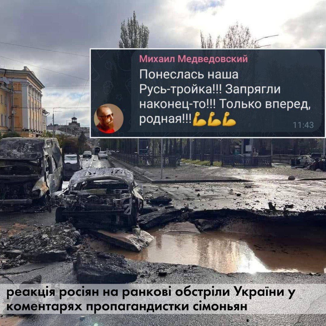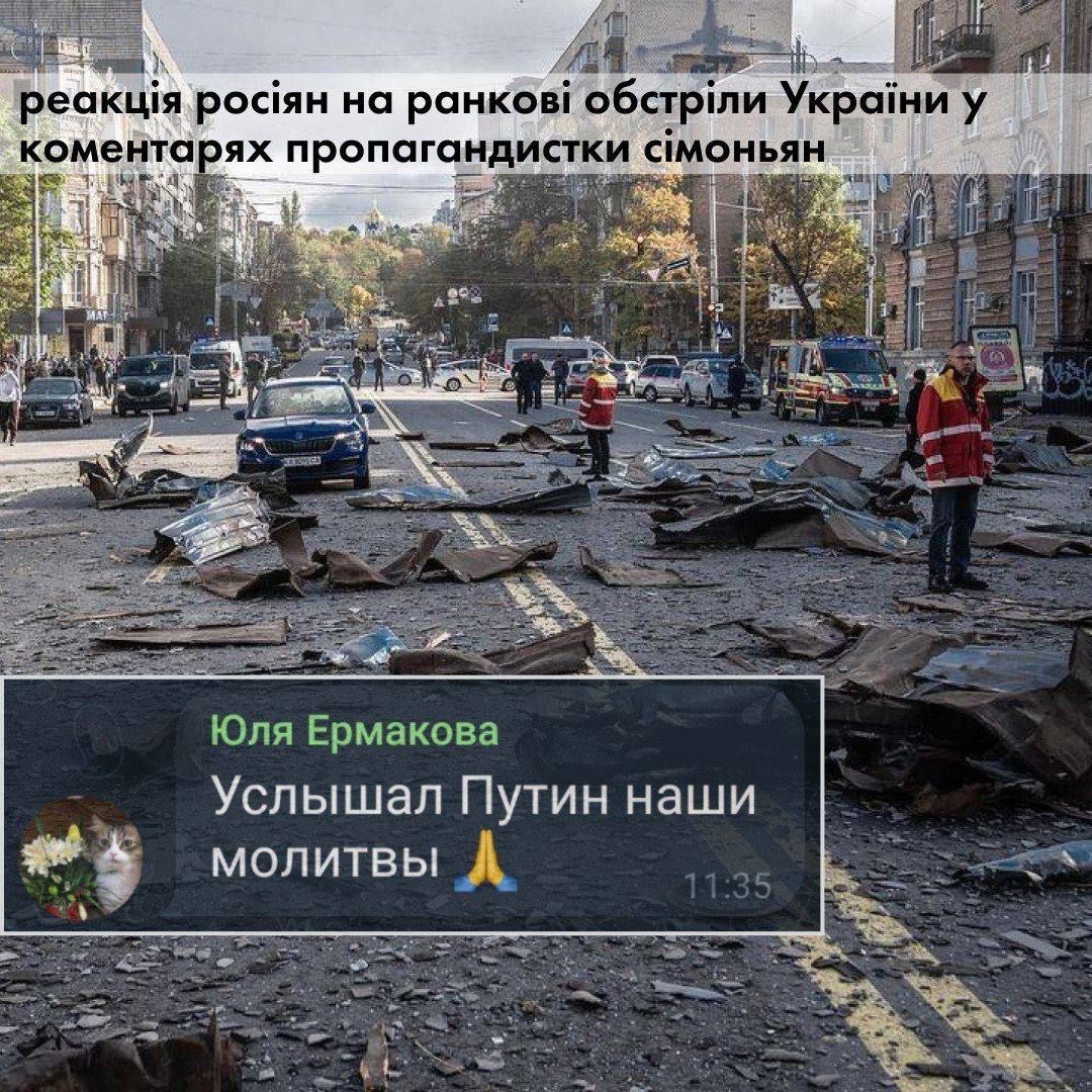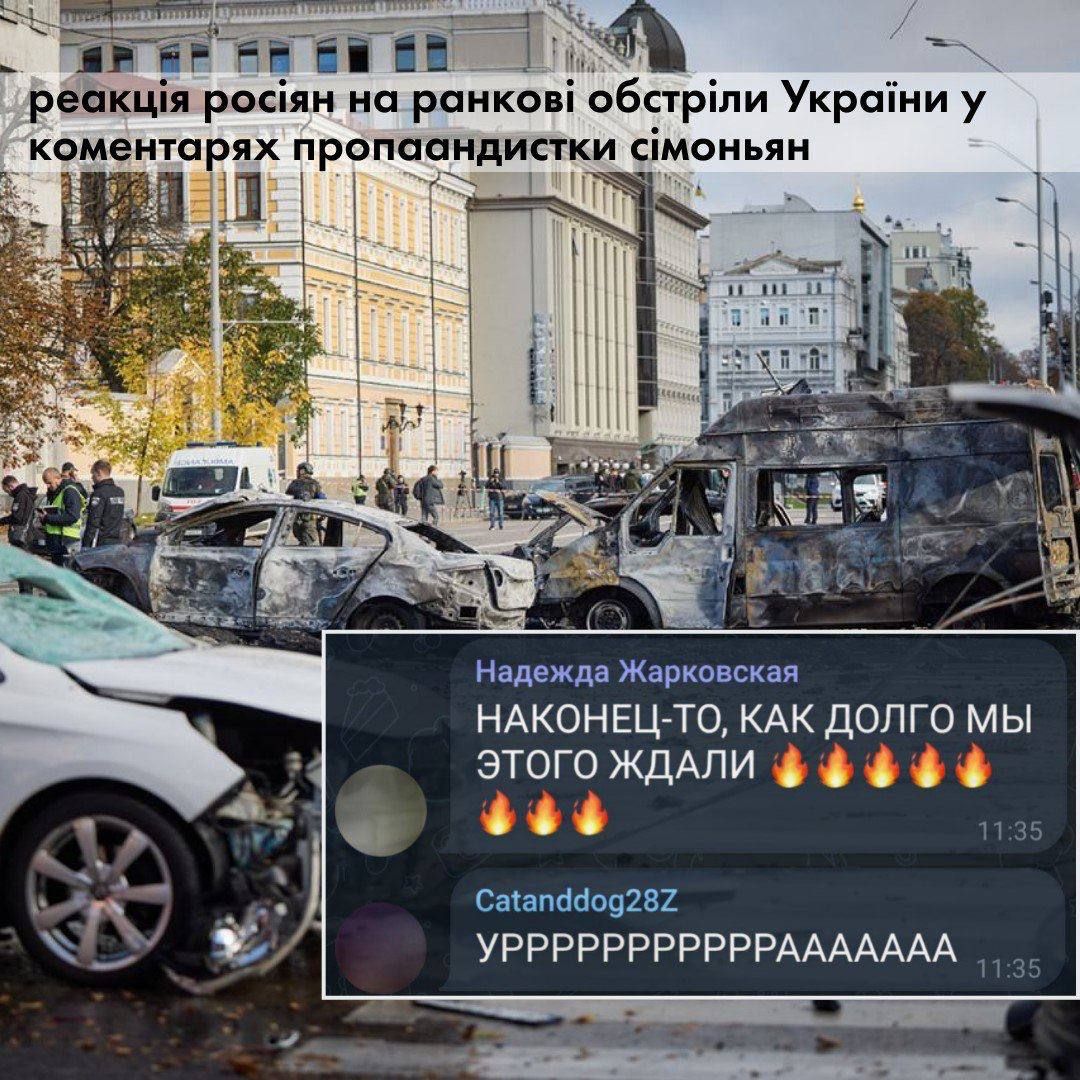 У коментарях в пропагандистки Маргаріти Сімоньян, яка назвала удари нібито "відповіддю за Кримський міст" зібралося чимало любителів радіти вбивствам та руйнуванням. Хтось зізнався, що вірить не у Бога, а в Путіна, а хтось назвав масовану атаку святом.