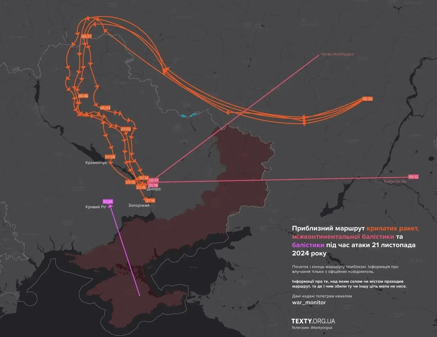 ЗМІ показали маршрут крилатих ракет та міжконтинентальної балістики під час атаки 21 листопада. Зазначається, що початок і кінець маршруту розраховані орієнтовно моніторинговими каналами.