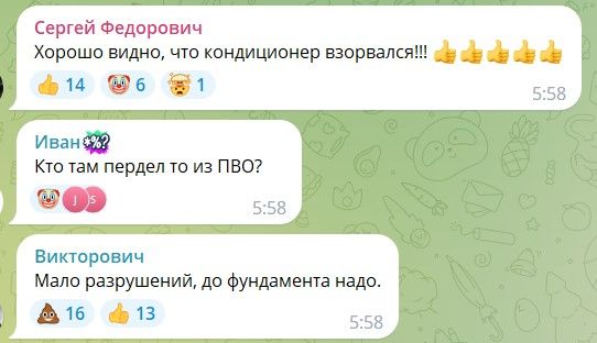 Інші ж пишуть, що влучили куди треба, а деяким персонажам мало зруйнованих 27 квартир під'їзду дев'ятиповерхівки. Кажуть, що треба зруйнувати абсолютно все.