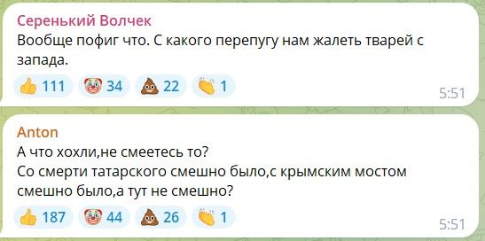 Ці коментарі – яскрава ілюстрація того, що наратив "це все Путін, а простий люд не винен" – не працює. Росіяни вкотре доводять, що підтримують війну та теракти і радіють з убивств мирних мешканців України.