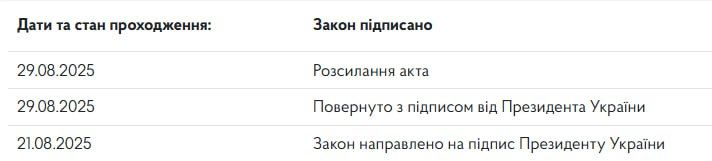 На сайті українського парламенту з'явилося оновлення, що 29 серпня президент Володимир Зеленський поставив підпис під законопроєктом №13273. Цей документ Верховна Рада ухвалила ще 21 серпня, тоді ж свій підпис під проєктом закону поставив голова ВР Руслан Стефанчук.