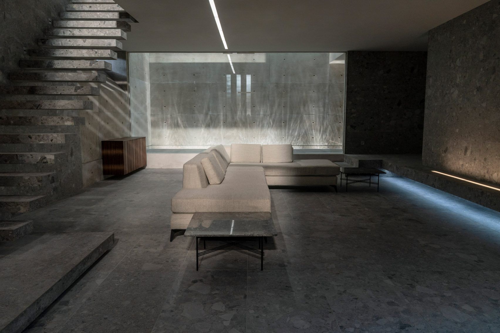 Його майже непомітно в ландшафті – доступ здійснюється через вузький міст над басейном. Усередині – темний бетон, мінімум декору й великі вікна, які пропускають лише обмежене світло. Цей дім ніби балансує між присутністю та відсутністю.