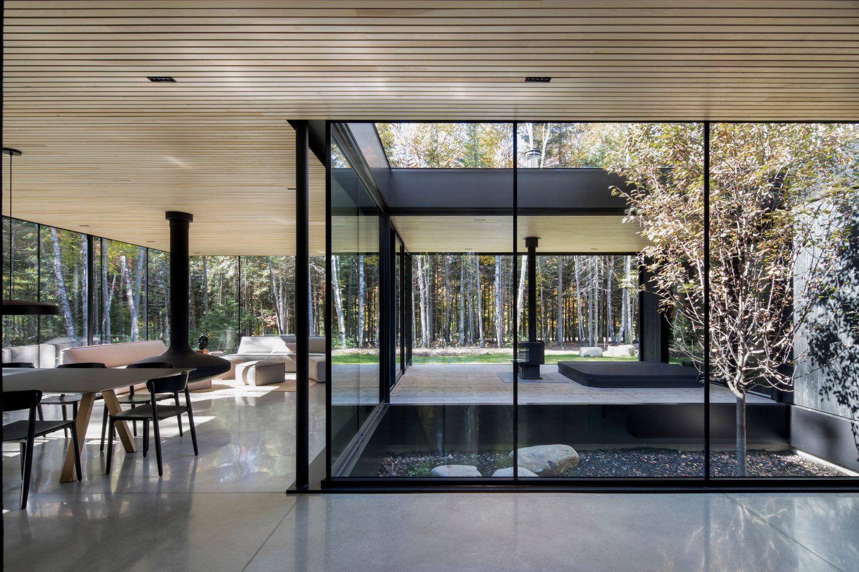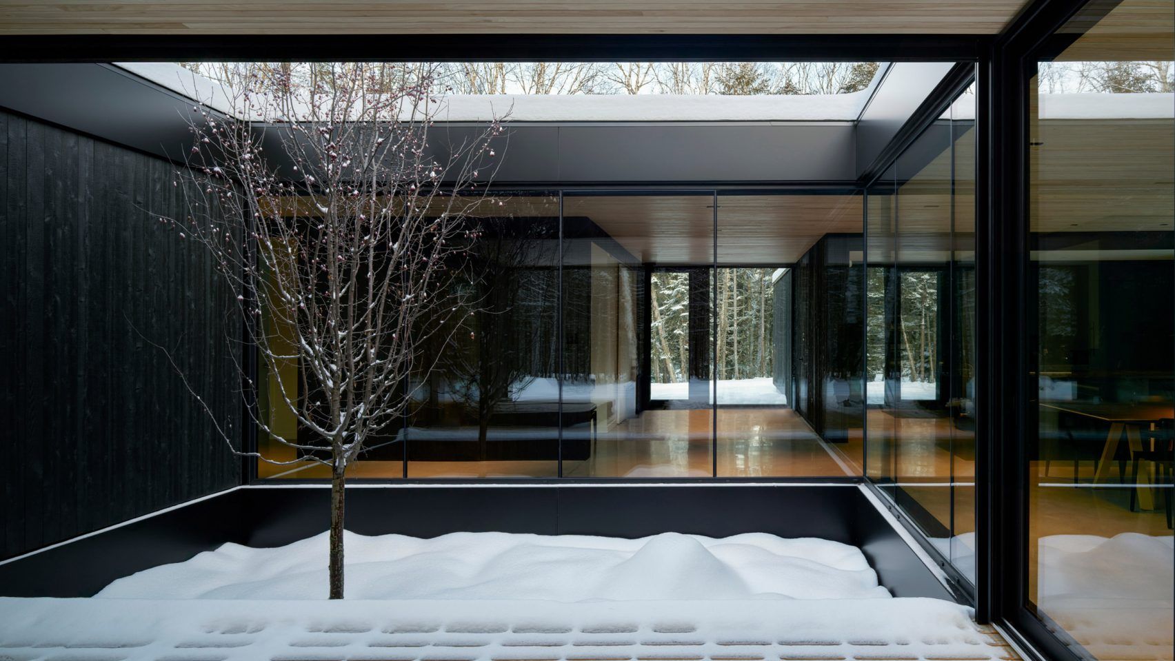У передмісті Монреаля розташований невисокий будинок, оздоблений чорною деревиною. Його структура побудована навколо внутрішнього двору з яблунею, що додає теплоти до стриманого образу.