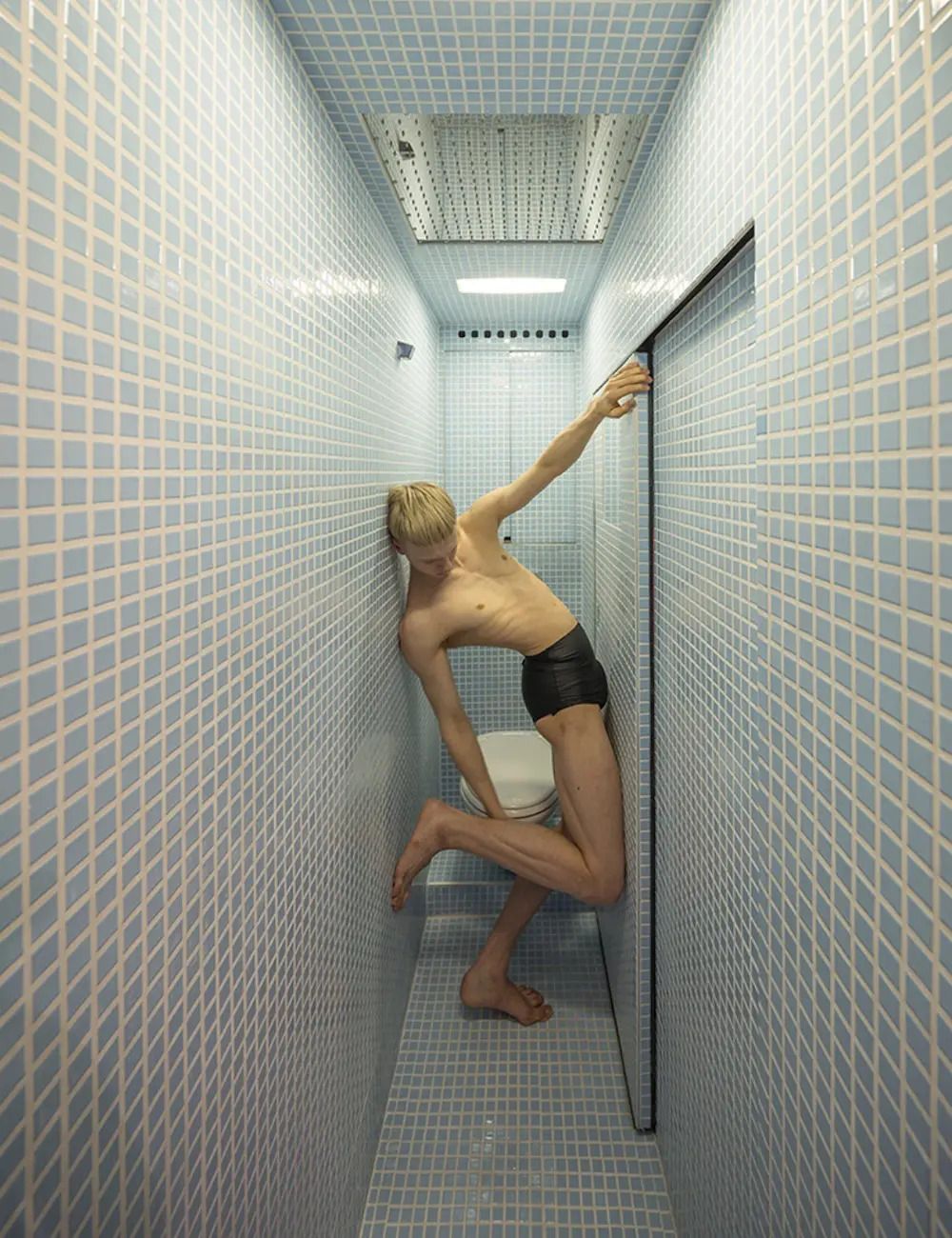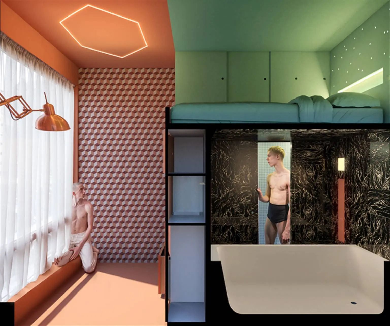 Простір поділено на чотири зони, кожна з яких вирізняється матеріалами. Там є все необхідне для комфортного проживання: спальне місце, вбудована кухня, туалет з душем і навіть спа з джакузі.