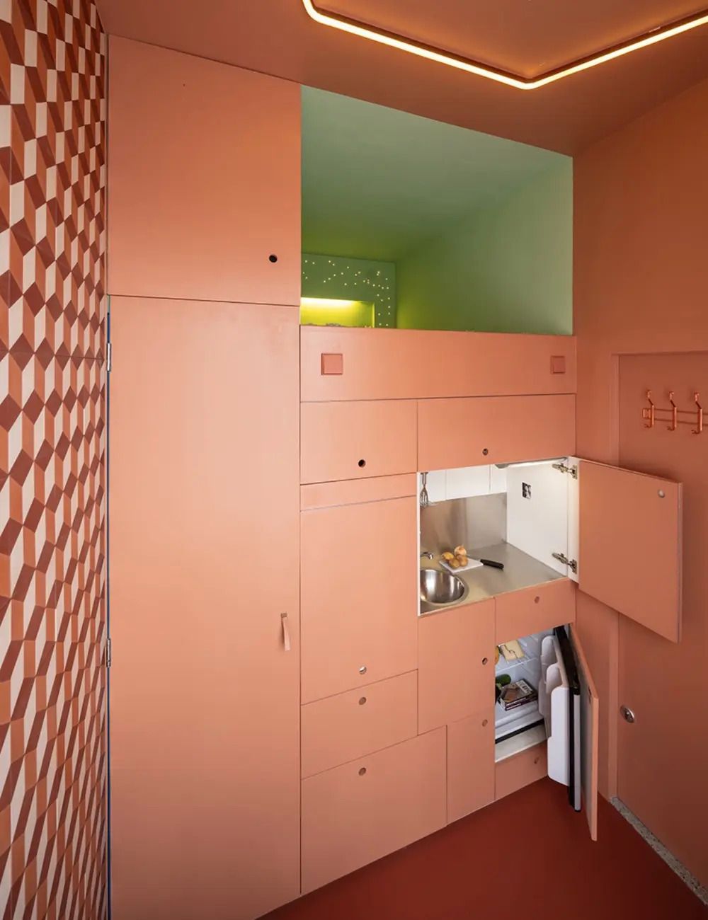 Кухня вбудована: мийка, варильна поверхня і холодильник розміщені по шафках, як і, власне, ліжко, де є трохи більше місця. Кімната нагадує гардероб чи навіть одну шафу.