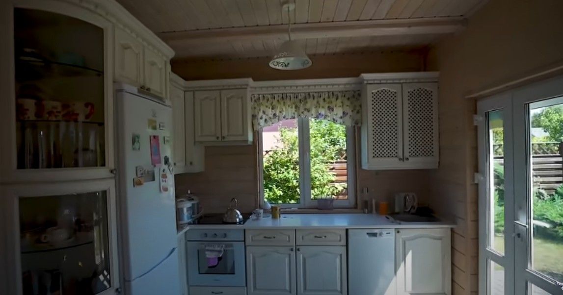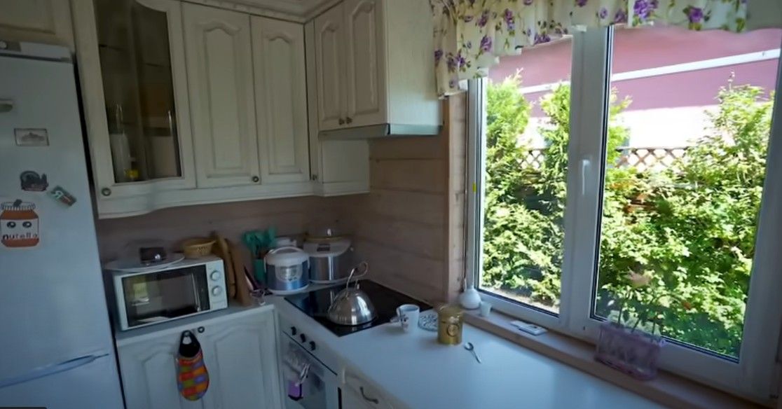 Світла й простора кухня телеведучої наповнена атмосферою тепла та домашнього затишку. У ній є великі двері, через які можна вийти на вулицю.