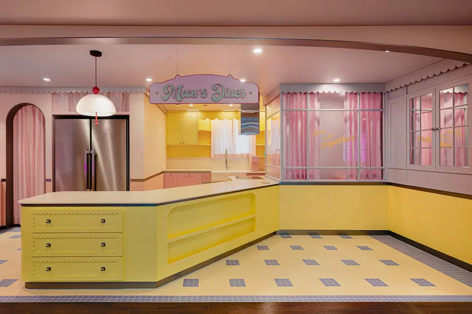 Як зазначають дизайнери, тут є абсолютно усе – від тривожних сцен з "Гри в кальмара" до цукерно-рожевої стилістики Барбі. Цей контраст працює саме завдяки поєднанню флуоресцентних кольорів, хвилястих декоративних панелей та шпалер із майже іграшковими візерунками.