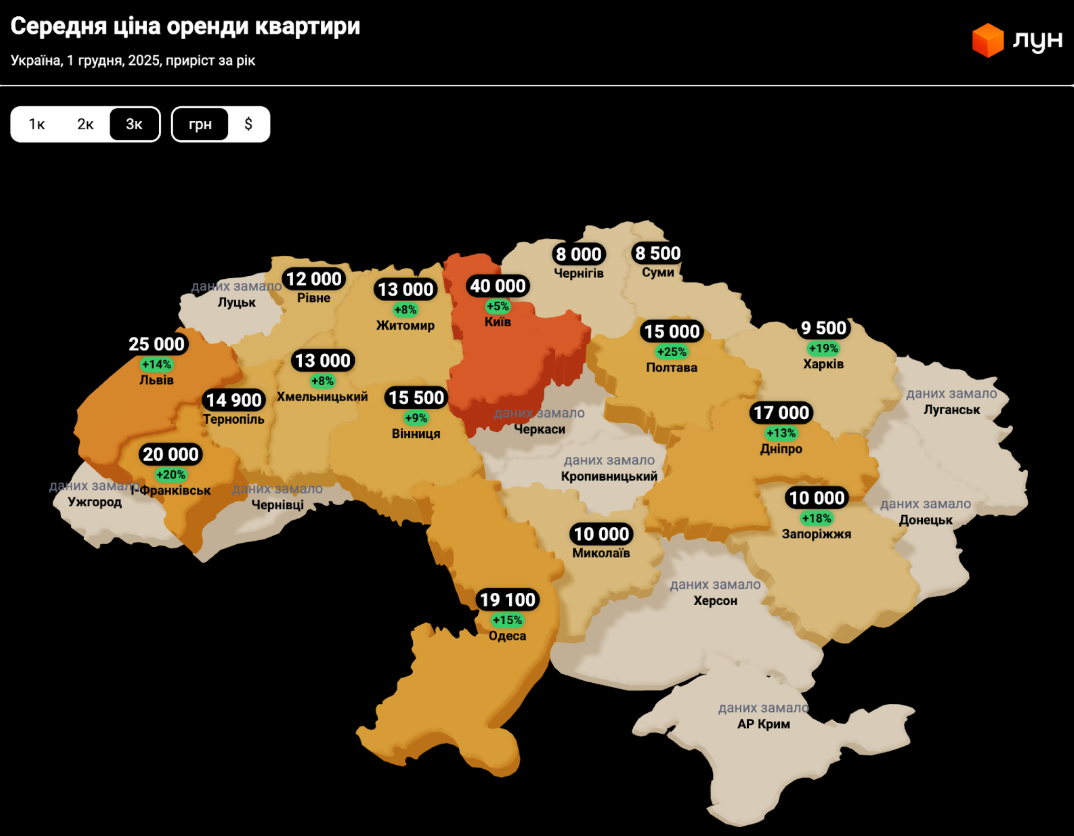 Якою була вартість оренди житла у різних містах України у 2025 році, 24 Канал розповідає з посиланням на річний звіт ЛУН.