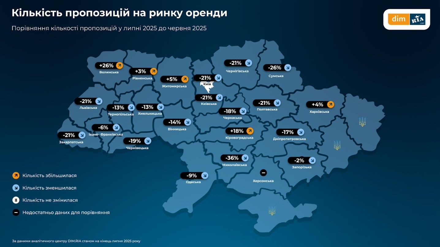 У решті регіонів оголошень про здачу квартир в оренду стало менше. Найвідчутніше пропозиція впала в областях: