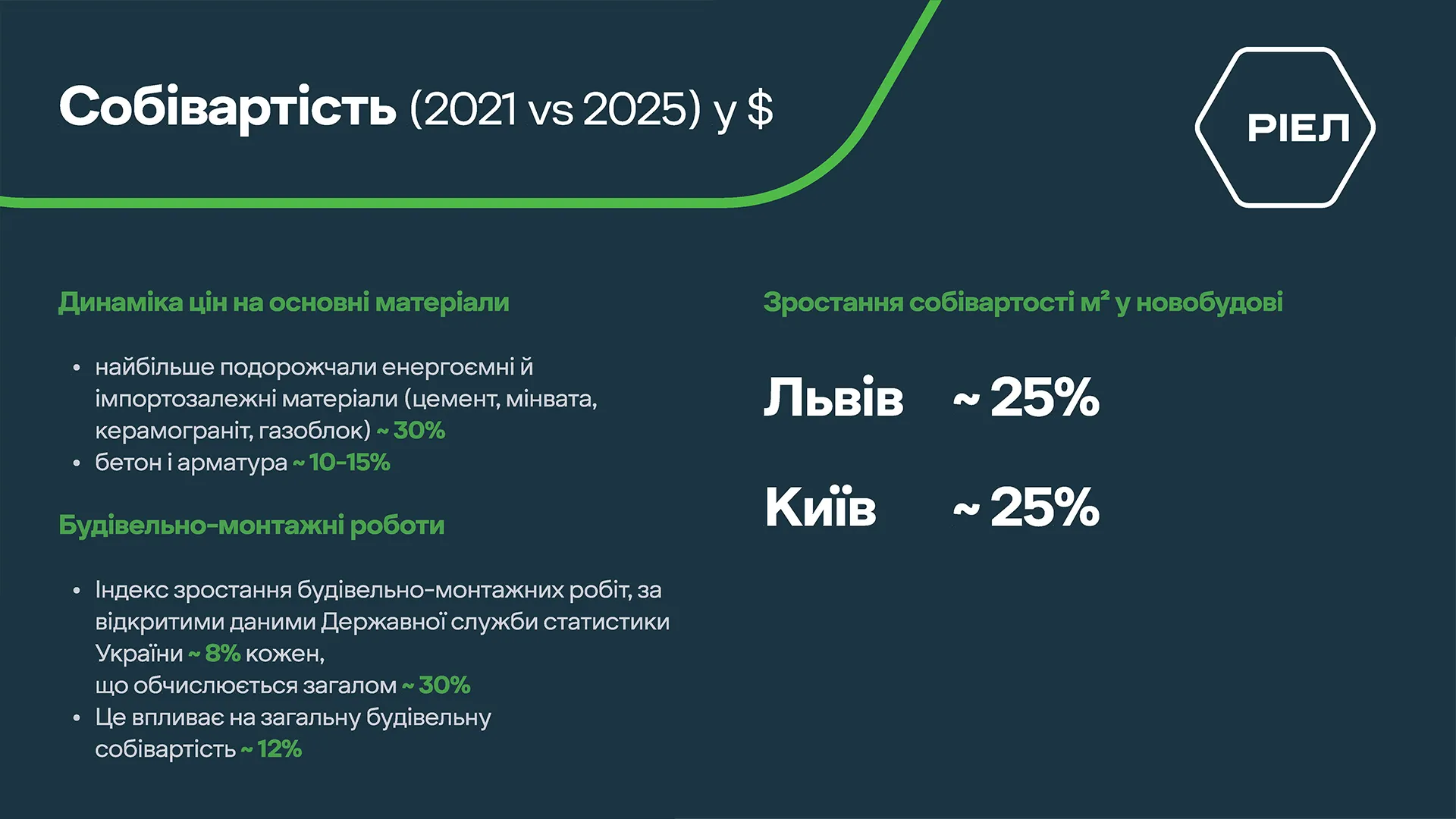 Для реализации проекта сегодня нужен больший ресурс. Это связано с ростом себестоимости материалов и строительно-монтажных работ: "Себестоимость квадратного метра в новостройке во Львове и Киеве в 2025 году выросла на 25%, по сравнению с 2021. Больше всего подорожали энергоемкие и импортозависимые материалы (цемент, минвата, керамогранит, газоблок) – на 30%, бетон и арматура – 10 – 15%. Стоимость строительно-монтажных работ повлияла на общую строительную себестоимость на 12%".