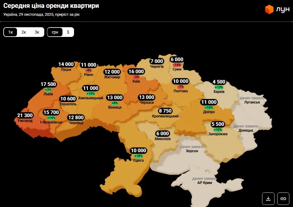 Цены аренду однокомнатных квартир в Украине / Инфографика ЛУН