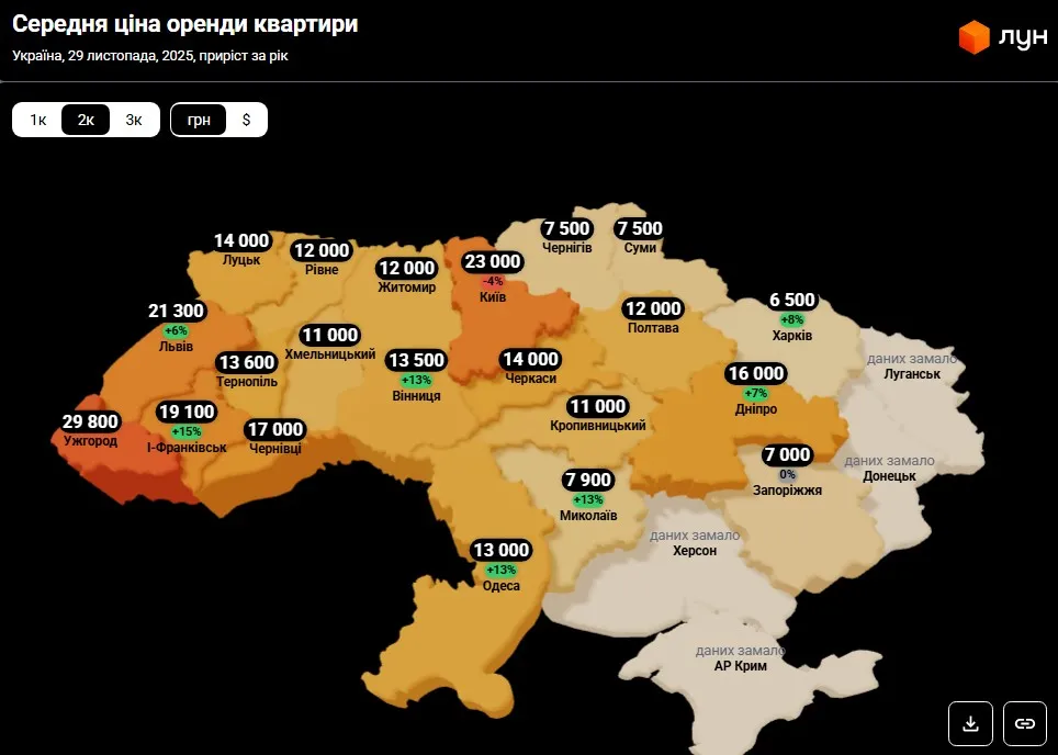 Цены аренду двухкомнатных квартир в Украине / Инфографика ЛУН
