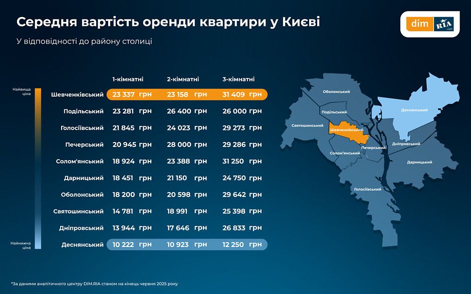 - Самые высокие цены на аренду однокомнатных квартир в Киеве пока не в Печерском районе, а в Шевченковском. Средняя стоимость составляет 23,3 тысячи гривен.