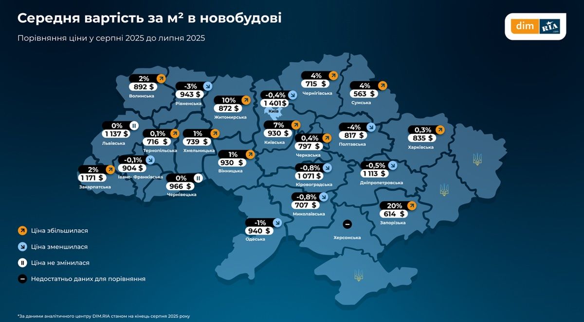 Об этом говорится в отчете платформы DIM.RIA, которая подготовила аналитический обзор изменений на рынке жилья за август 2025 года, и который цитирует 24 Канал.