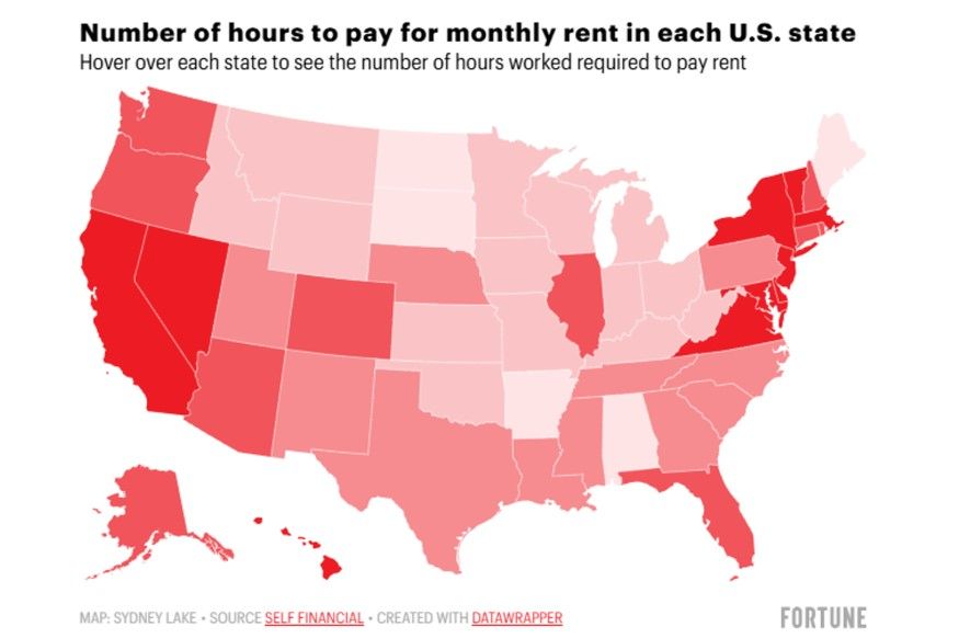 Количество часов труда, необходимых для покрытия ежемесячной арендной платы в каждом штате / Фото Self Financial