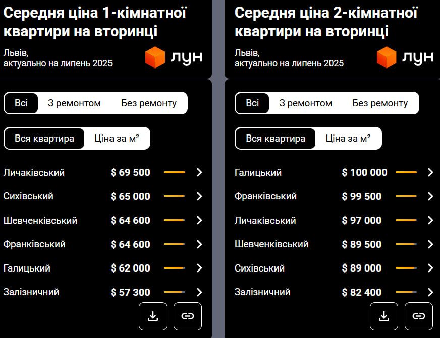 Средние цены на жилье на вторичке во Львове / Скриншот из статистики ЛУН