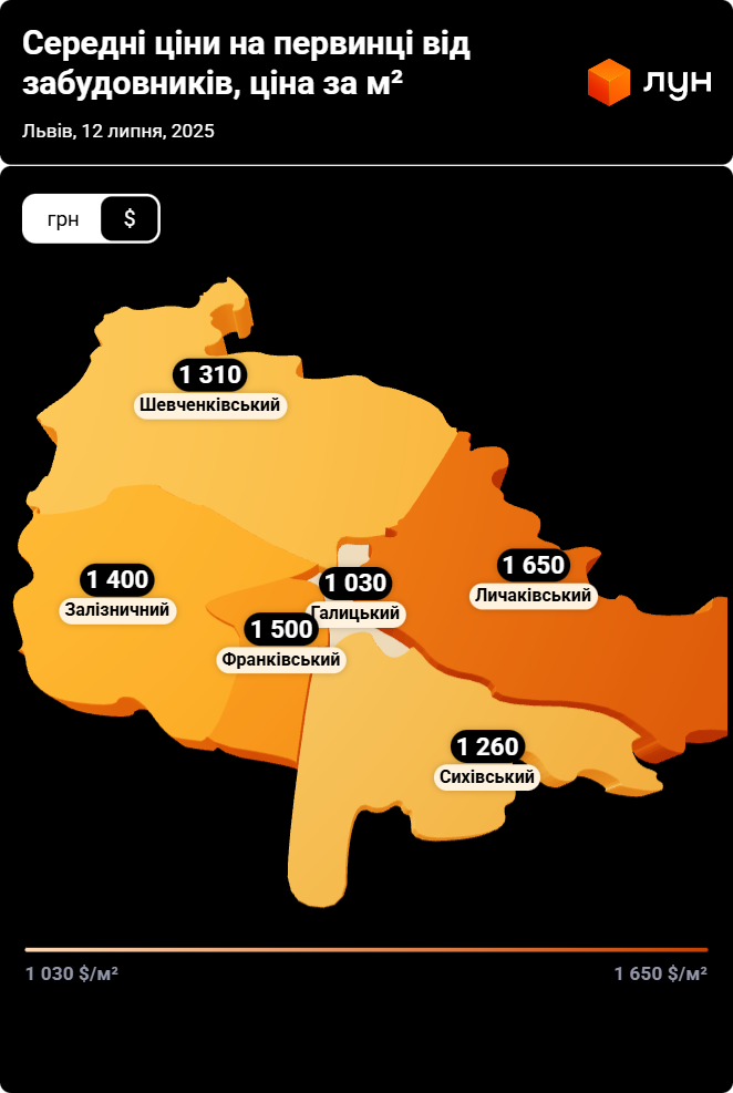 Самое интересное то, что если на вторичке Галицкий район является одним из самых дорогих для покупки жилья, то на первичном рынке метр квадратный в этом районе самый дешевый из всех – всего 1 030 долларов. Самая высокая цена зато в Лычаковском районе – 1 650 долларов за метр квадратный.