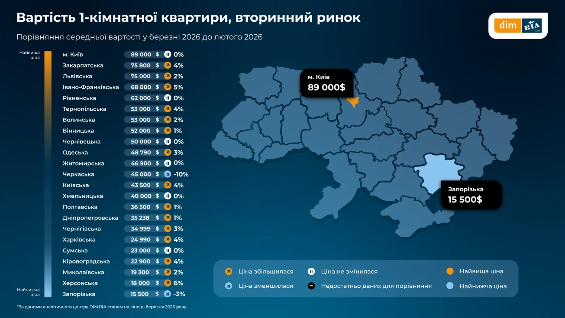Средняя стоимость однокомнатной квартиры в Украине / Инфографика Dim.ria