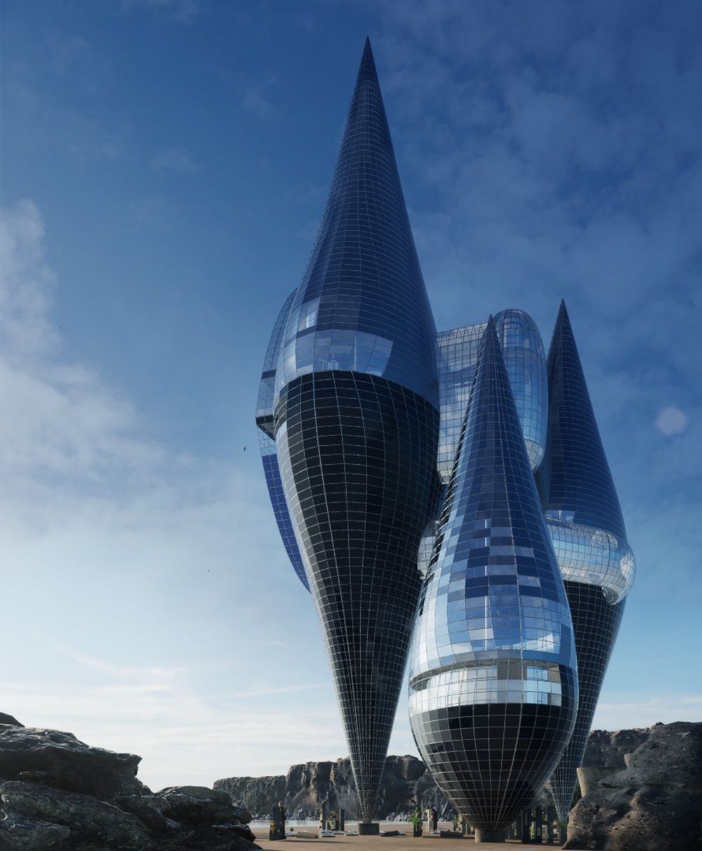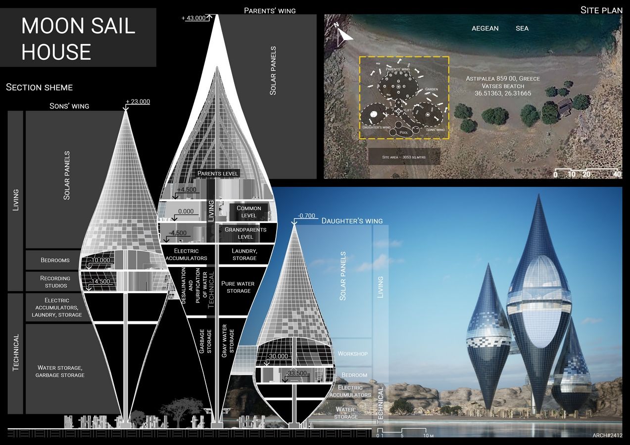 Проект с символическим названием Moonsail ("Лунный парус") спроектировали для возможного строительства на греческом острове Астипалея. Он разделен на три части, одинаковые по форме, рассказывает 24 Канал, ссылаясь на студию Vizdome Space.