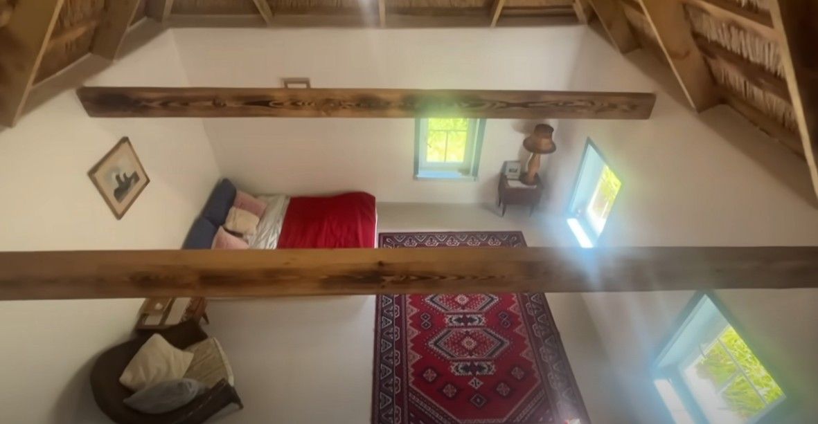Особое место занимает лестница – символ и название второй книги писательницы. На втором уровне обустраивают спальную зону с деревянными балясинами – места хватит даже для большой компании. Под крышей видно все детали здания. Там можно будет ночевать, хотя звукоизоляция минимальная.
