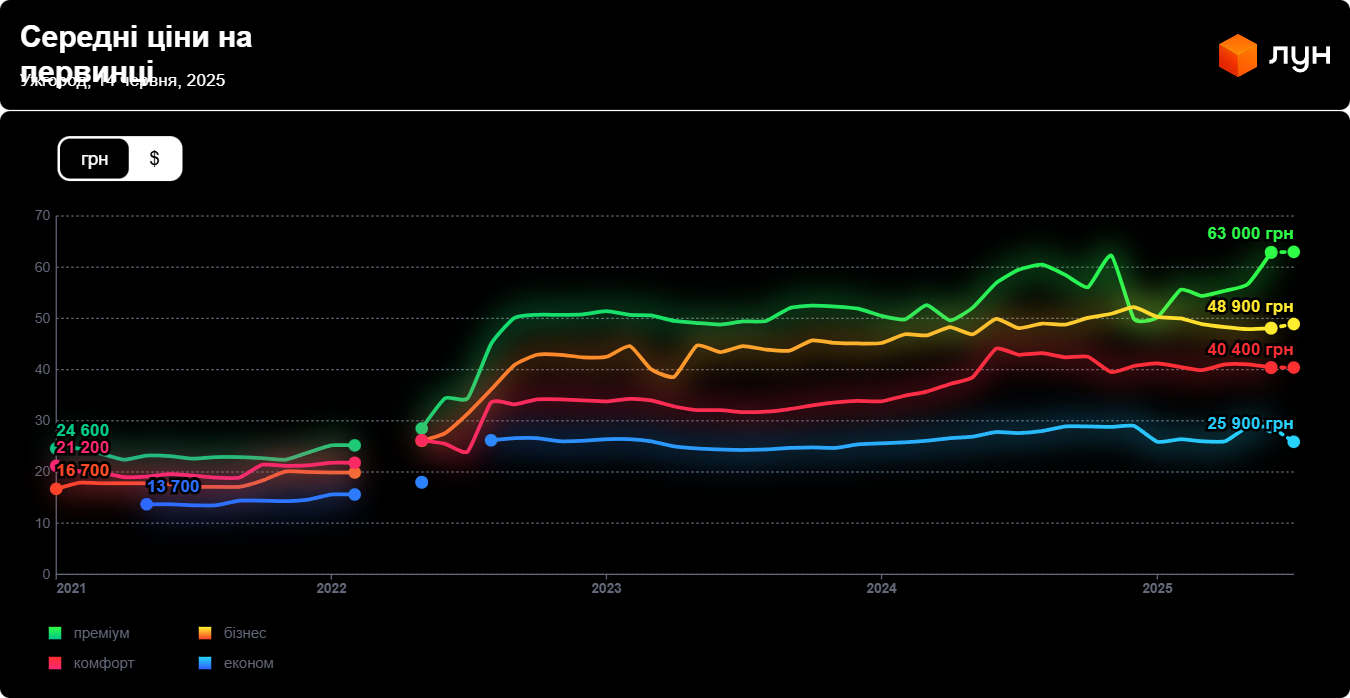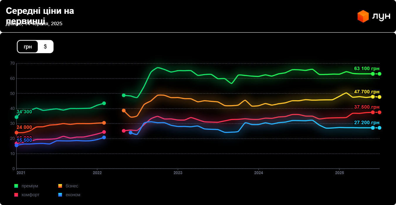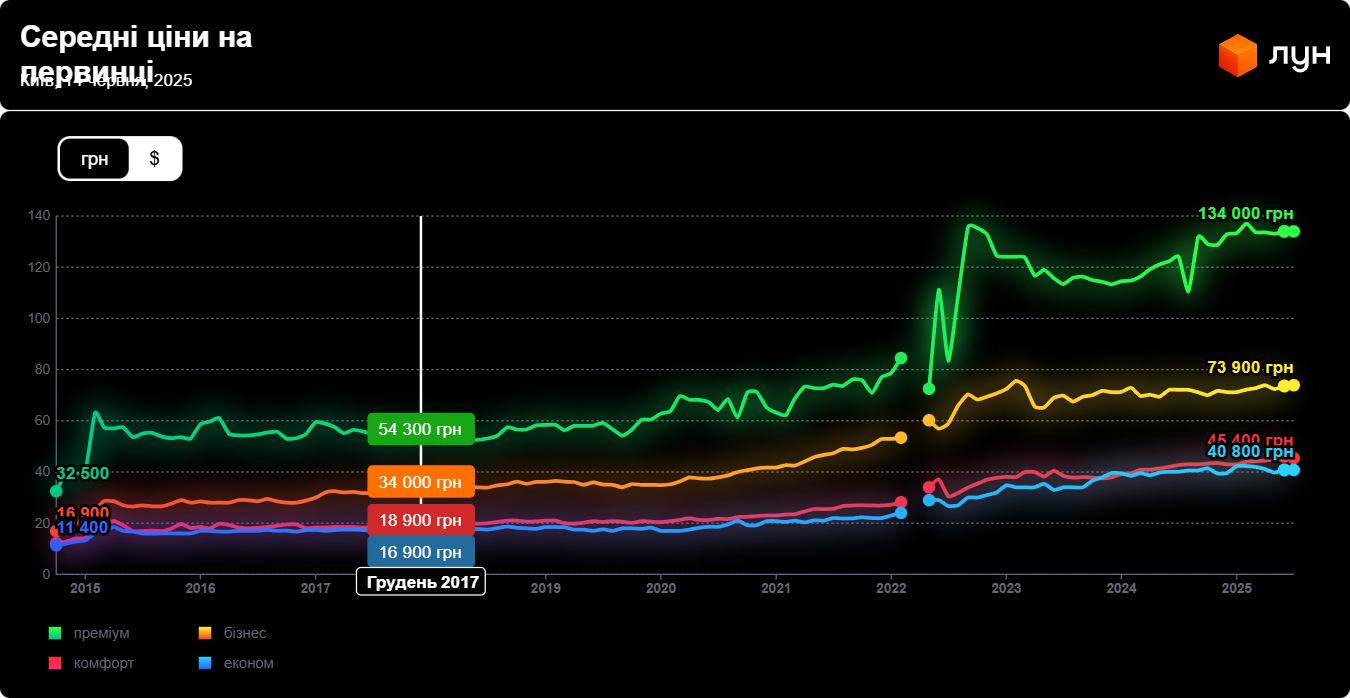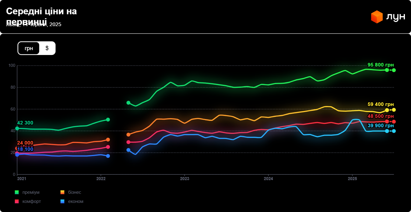 Премиум – 52 200 гривен за квадратный метр, а бизнес – 40 800 гривен.