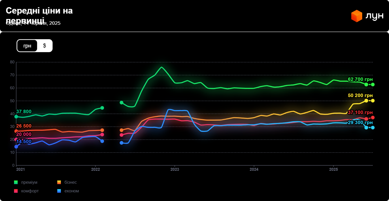 Несмотря на военные факторы, в городе за квадратный метр класса премиум надо отдать в среднем 49 800 гривен, а за бизнес – 33 500 гривен.